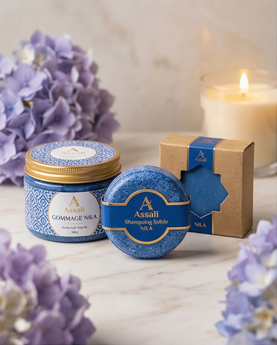 Pack au nila composĂ© : 1 shampoing solide 80gr – 1 gommage pour le corps de 200gr et 1 savon Ă froid pour le corps 100gr